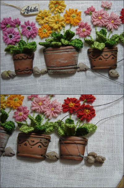 Now, with a coffee-colored thread on my needle, I start sewing the first flower pot.